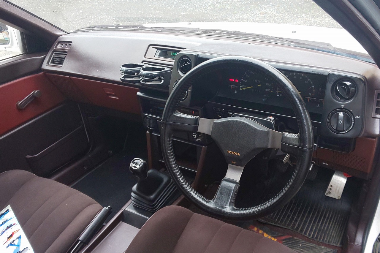 屋内保管されていたからか内外装の程度の良い白/黒の2ドアレビンのGTアペックスです。エアコン、パワステ付きでアペックスのエアクリ、フジツボマフラー、社外足回り、社外クラッチ、社外LSDなど装着してあります。カリカリにチューニングしてある車ではないので、街乗りでもAE86の楽しさを体感できそうな改造車です。