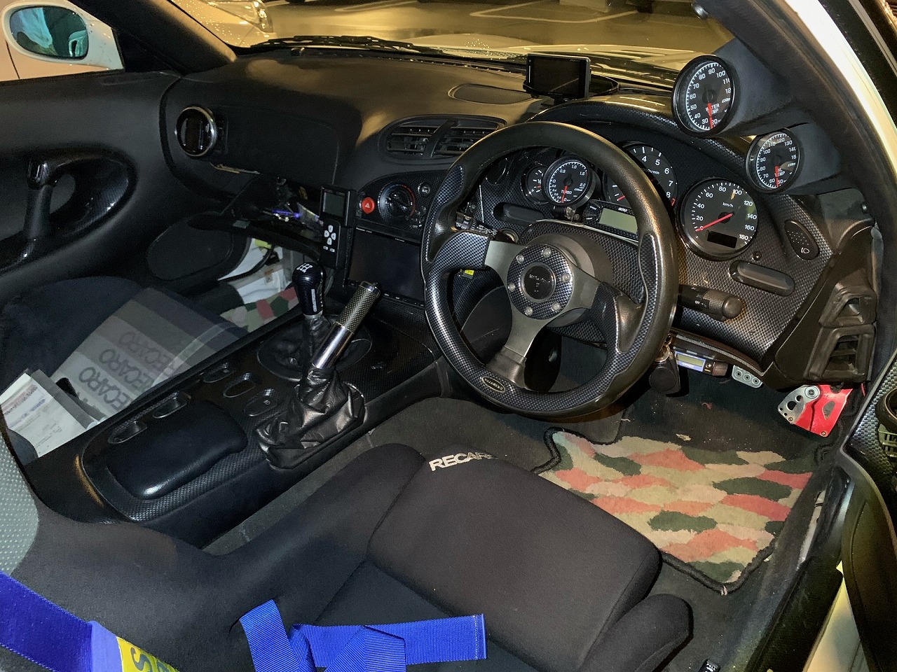 内装にはメーター類が追加され社外ステアリング、レカロフルバケ、セミバケに交換してありサーキット走行もすぐに可能です!当店ではRX-7(FD3S)やFC3S、RX-8、ユーノスコスモ等ロータリーエンジンを搭載した車、チューニングカーも力を入れて買取しておりますので是非CPSまでお問い合わせ下さい‼