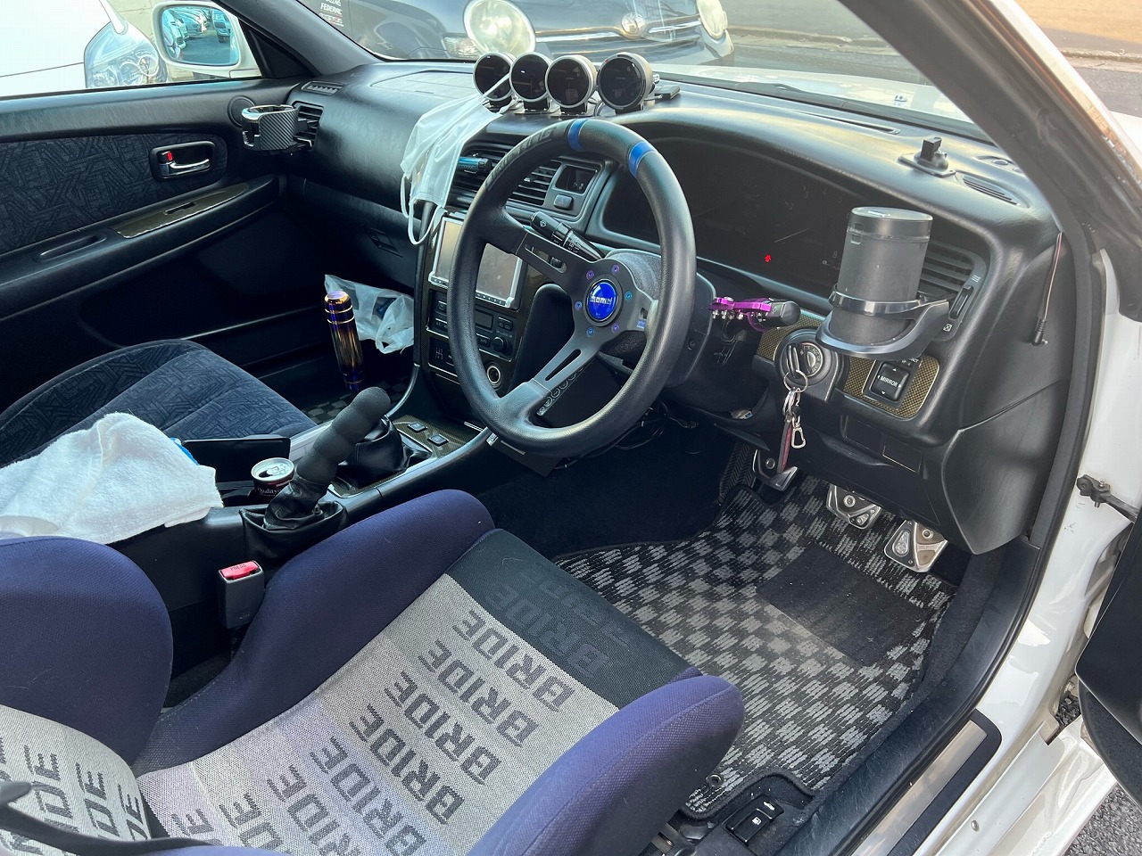 BLITZ エアクリ、インタークーラー、ブローオフバルブ/TOMEI タービンアウトレット/社外マフラー、サクションパイプ/D-MAX 車高調/クスコ フロントアッパーアーム/オリジン レーシングライン フロントバンパー、サイドステップ、リアバンパー/Work 極 19インチ/SONAR テールランプ/Defi ブースト計、水温計、油温計、油圧計/BRIDE セミバケ/MOMO ステアリング etc. エンジン関係はBLITZ エアクリ、インタークーラー、ブローオフ、GPスポーツ キャタライザー、社外マフラーと吸排気チューンが施されております! 内装はBRIDE セミバケ、Defi 追加メーター、MOMO ステアリング等に交換されております!