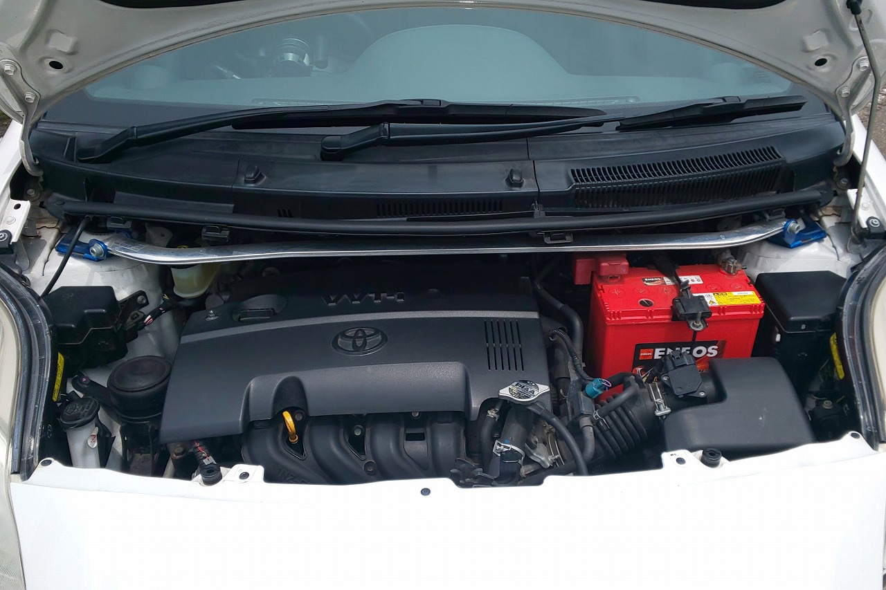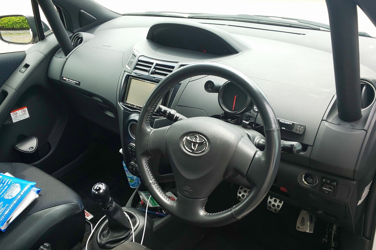 TRDのエキマニ、マフラー、LSD、ロールバーなどが標準装着されたヴィッツTRDレーシングをベースに足回り、エアクリを交換した改造車です。