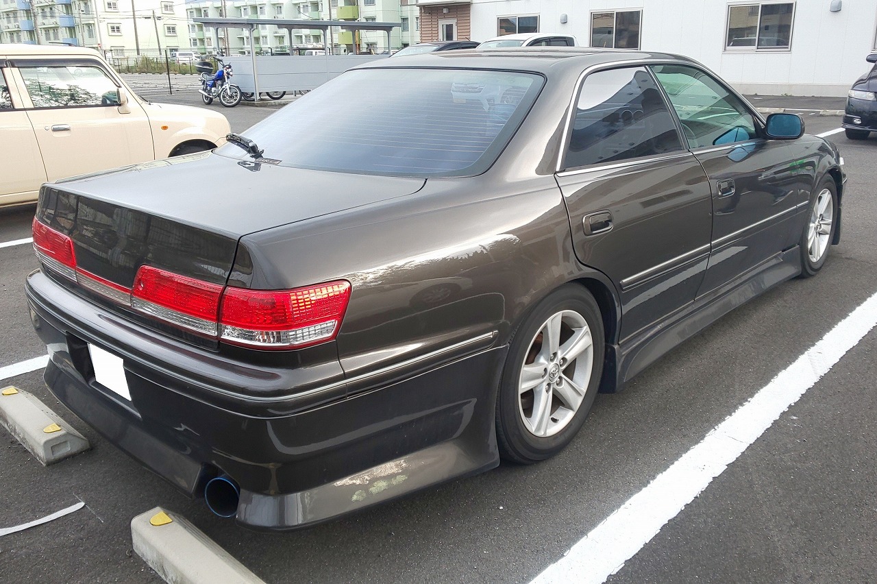 サンルーフ付き前期のマーク2を後期ルックにしフルエアロを組みブロンズのオールペンしてあります。オートマからマニュアルにしてありインタークーラー、マフラー、車高調が組んであります。査定時はマークX純正ホイールでしたが、R34GT-Rホイールもセットで買取しました。