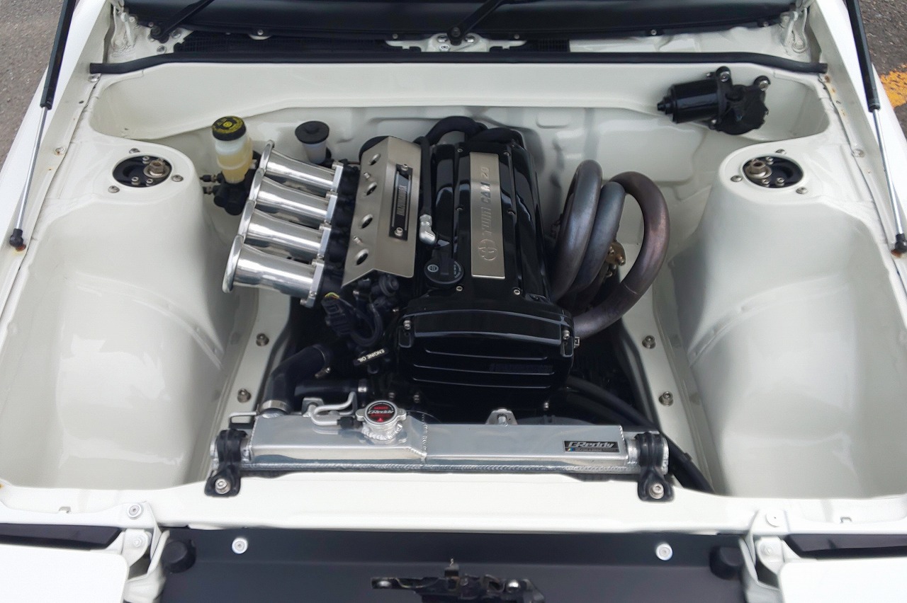 5バルブエンジン換装/トラストラジエター/社外タコ足/ワンオフマフラー/ワイヤータッグ/社外オイルクーラー/フリーダムCPU/車高調/社外ラテラルロッド/グッドラインFフェンダー/リアフェンダー叩き出しアーチ上げ/タカセスタウトボンネット/ルーフスポイラー/ブリッドシート/社外ステアリングなど