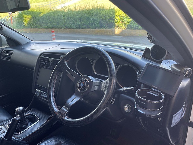 内装はナルディステアリング、社外9インチモニター、デフィブースト計を装着されレザーシート、パワーシート、シートヒーター、サンルーフも装備されたお車です。