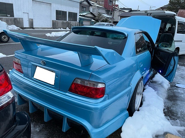 平成11年式 チェイサー ツアラーV AT→MT載せ替え5速公認で走行距離が19.2万kmです!!外装はクラウン特別仕様車の空色にオールペンされ、ORIGINのフロントバンパー、サイドステップ、リアバンパー、N-STYLEオーバーフェンダー、326POWER満力ウイング、SERADRIFT18インチアルミホイール装着しKTS車高調でローダウンされております。