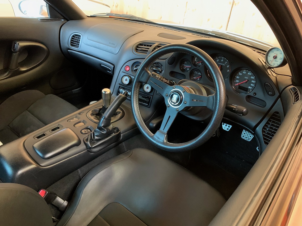アームはタイロッドエンドピロ、スタビライザーエンドピロ等フルピロ化しており足がしっかり動くようセットされております! 駆動系はOS技研5速クロスミッション、OS技研ツインプレートクラッチ、ステンメッシュクラッチライン、クラッチビッグレリーズ、カーツ2WAY LSD等に変更してあります! エンジンはサイドポート仕様でFEEDアペックスシールDLC、GCG GTW3684Rタービン、HKSウエストゲート、FEED燃料ポンプ、850ccインジェクター、FEEDビックスロットル、スロットルアダプター、FEEDインタークーラー、ラジエター、オイルクーラー、FEEDワンオフエキマニ、ワンオフフロントパイプ、チタンマフラー等にチューニングされHKS EVCにてブースト1.1に設定されパワーFC制御で出力が493PSとかなりハイスペックな車両になります! 車内はダッシュボードや内張非常に状態がよく革のBRIDEフルバケに交換しナルディステアリング、APEXブースト計、HKS水温計、油圧計、燃圧計が追加されPIVOTのシフトタイミングライトも装着されております!